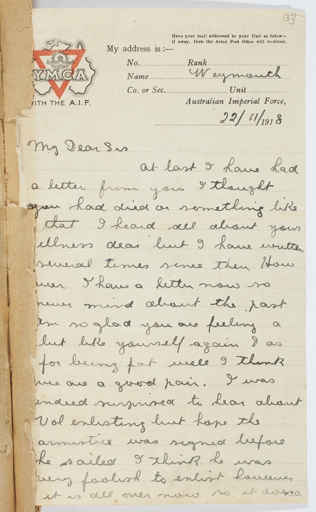 At last I have had a letter from you. I thought you had died or something like that. I heard all about your illness dear but I have written several times since then. However I have a letter now so never mind about the past. I am so glad you are feeling a bit like yourself again & as for being fat well I think we are a good pair. I was indeed surprised to hear about Vol enlisting but hope the armistice was signed before he sailed. I think he was very foolish to enlist however it is all over now so it does