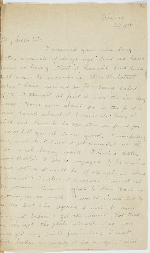 I received your nice long letter a couple of days ago but we have been so busy that I haven't had time till now to answer it. It is the latest letter I have received so far being dated 3/1/17. I thought at first it was the Sunday Times. Your news about pa is the first I have heard about it & sincerely hope he will not have to be operated on for it for I can tell you it is no good. I am feeling very well but I soon get knocked up if I do much heavy work. I had a letter from Bobbie & she is engaged to be married. How rotten it will be if she gets in ahead of Laurel & I, still I suppose I must not be jealous. Am so glad to hear Noni is getting on so well. I would indeed like to see her but I'm afraid it will be some time yet before I get the chance. Lol told me she got the photo alright. Did you ever get my photo from her? I met Bob Sykes a couple of days ago (Violet