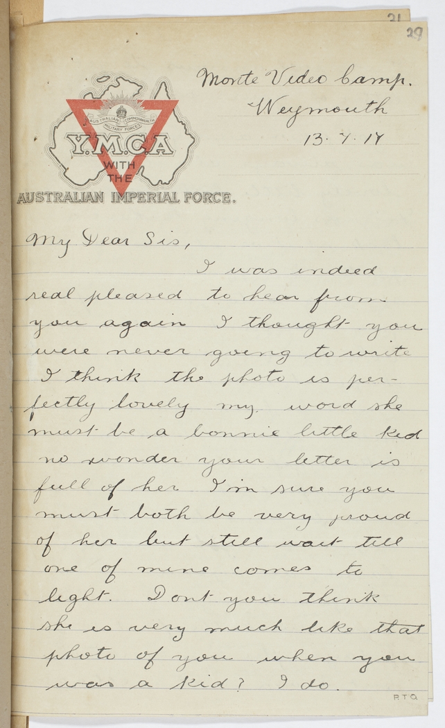 I was indeed real pleased to hear from you again. I thought you were never going to write. I think the photo is perfectly lovely my word she must be a bonnie little kid no wonder your letter is full of her. I'm sure you must both be very proud of her but still wait till one of mine comes to light. Don't you think she is very much like that photo of you when you was a kid? I do.
