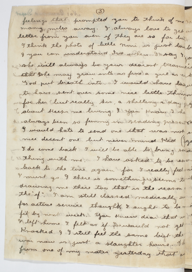 feelings that prompted you to think of me many miles away. I always love to get a letter from you even if they are so far between. I think the photo of little Noni is just lovely & you can understand Ive when I say (indecipherable] she will always be your dearest treasure that she may grow into as fine a girl as ever God put breath into. I would have loved to have sent over some nice little things for her but really Sis, a shilling a day just about keeps me living & you know I have always been so funny in sending presents. I would hate to send one that was not a nice decent one but never mind kid (indecipherable I do come back I will be able to bring something with me. I have asked to be sent back to the line again for I really feel I must go & there is something seems to be drawing me there too that is the reason [indecipherable] the "if". I am still classed medically unfit for active service though t I ought to be fit by next week. You know dear that when I left home I felt as if I would not get knocked & I still feel the same but the war now is just a slaughter house. I heard from one of my mates yesterday that out