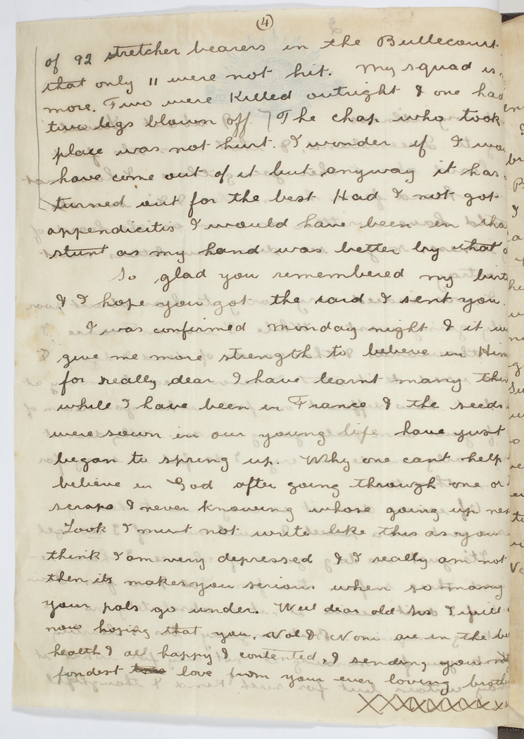 So glad you remembered my birthday & I hope you got the card I sent you. I was confirmed Monday night & it will give me more strength to believe in Him for really dear I have learnt many things while I have been in France & the seeds that were sown in our young life have just began to spring up. Why one can't help but believe in God after going through one or [indecipherable] scraps & never knowing whose going up next. Look I must not write like this as you will think I am very depressed & I really am not but then its makes you serious when so many of your pals go under. Well dear old Sis I will close now hoping that you, Vol and N are in the best of health & all happy & contented, & sending you my fondest true