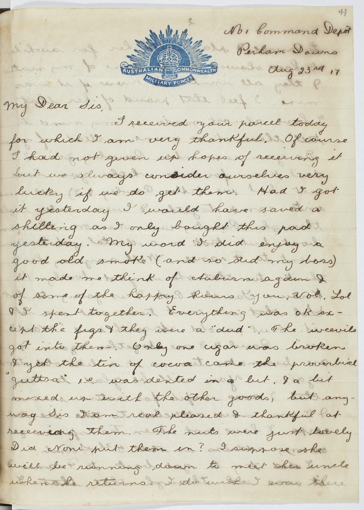 I received your parcel today for which I am very thankful. Of course I had not given up hope of receiving it but we always consider ourselves very lucky if we do get them. Had I got it yesterday I would have saved a shilling as I only bought this pad yesterday. My word I did enjoy a good old smoke (and so did my boss) it made me think of Auburn again & of some of the happy hours you, Vol, Lol & I spent together. Everything was OK except the figs & they were a "dud". The weevils got into them. Only one cigar was broken & yet the tin of cocoa came the proverbial "guttsa" i.e. was dented in a bit, & a bit mixed up with the other goods, but anyway Sis I am real pleased & thankful at receiving them. The nuts were just lovely. Did Noni put them in? I suppose she will be running down to meet her uncle when he returns. I do wish I was there