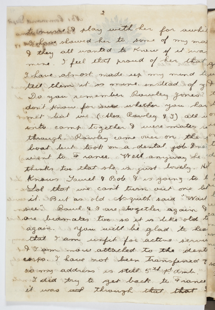 to nurse & play with her for a while. I have showed her to some of my mates & they all wanted to know if it was mine. I feel that proud of her that I have almost made up my mind to tell them it is mine instead of yours. Do you remember Rowley Jones? I don't know for sure whether you have met but we (Alex Rowley & I) all went into camp together & were mates right through. Rowley came over on the same boat but took on a dental job & never went to France. Well anyway he thinks too that she is just lovely. He knows Laurel & Bob & is going to bet Lol that we can't turn out one like it. But as old Asquith said "Wait and see". Rowl & I are together again & are bedmates too so it is like old times again. You will be glad to hear that I am unfit for active service and am now attached to the dental corps. I have not been transferred yet so my address is still 5th F. Amb. I did try to get back to France and it was wh through that that I