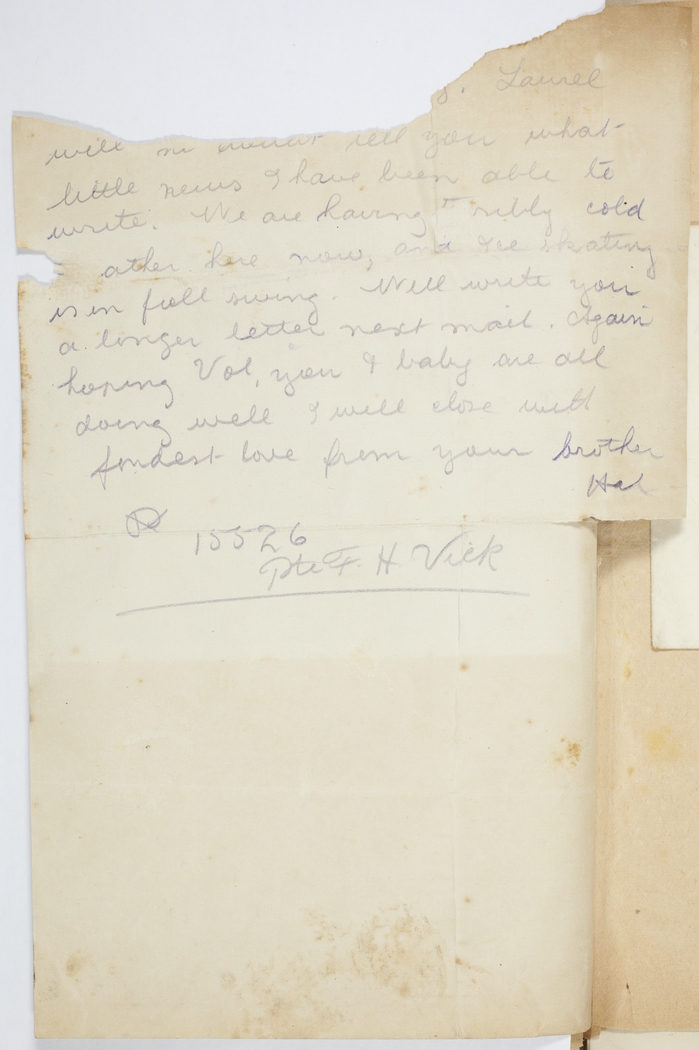 [Indecipherable]. Laurel will no doubt tell you what little news I have been able to write. We are having terribly cold weather here now, and ice skating is in full swing. Will write you a longer letter next mail. Again hoping Vol, you & baby are all doing well. I will close with fondest love from your brother HalP 15526 Pte F.H. Vick