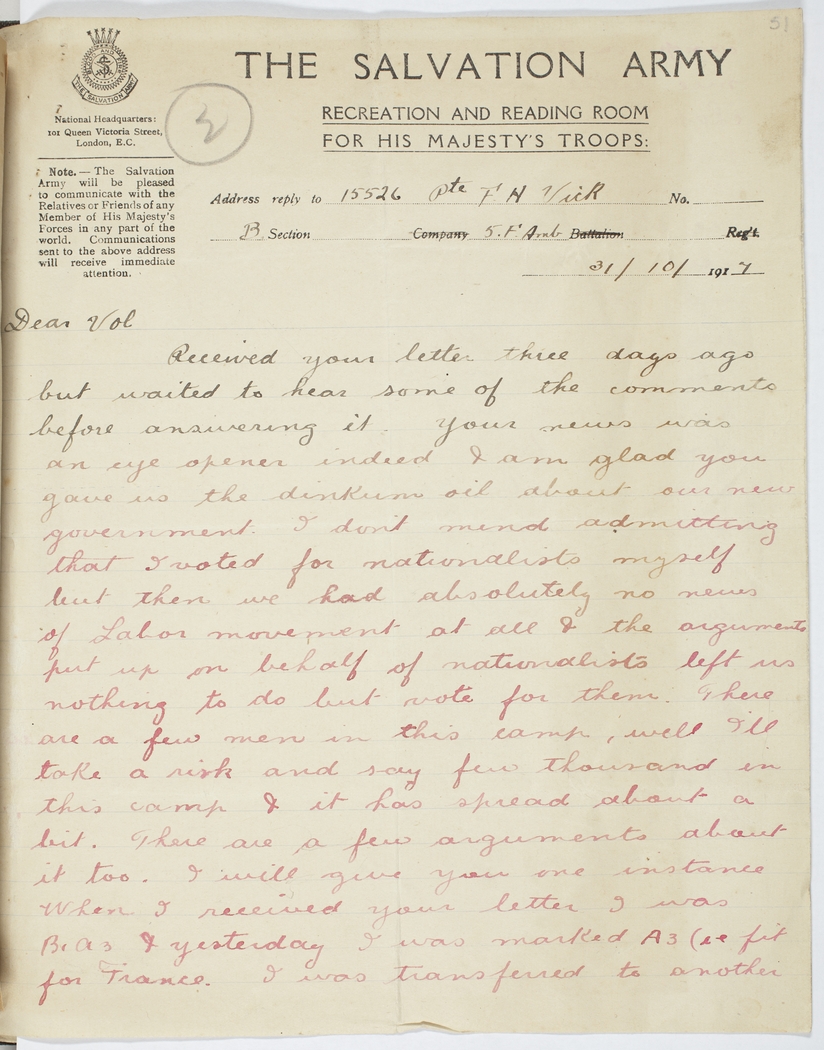 Received your letter three days ago but waited to hear some of the comments before answering it. Your news was an eye opener indeed & am glad you gave us the dinkum oil about our new government. I don't mind admitting that I voted for nationalists myself but then we had absolutely no news of Labor movement at all & the arguments put up on behalf of nationalists left us nothing to do but vote for them. There are a few men in this camp, well I'll take a risk and say few thousand in this camp & it has spread about a bit. There are a few arguments about it too. I will give you one instance When I received your letter I was B1A3 & yesterday I was marked A3 (i.e. fit for France. I was transferred to another