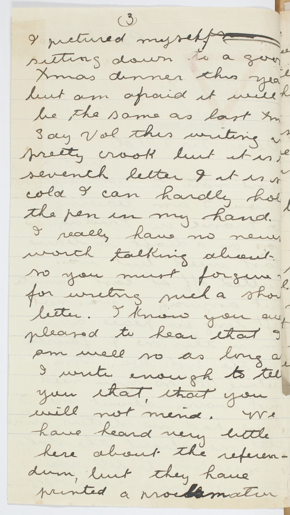 & pictured myself sitting down to a good Xmas dinner this year but am afraid it will be the same as last Xmas. Say Vol this writing is pretty crook but it is my seventh letter & it is so cold I can hardly hold the pen in my hand. I really have no news worth talking about so you must forgive me for writing such a short letter. I know you are pleased to hear that I am well so as long as I write enough to tell you that, that you will not mind. We have heard very little here about the referendum, but they have printed a proclamation