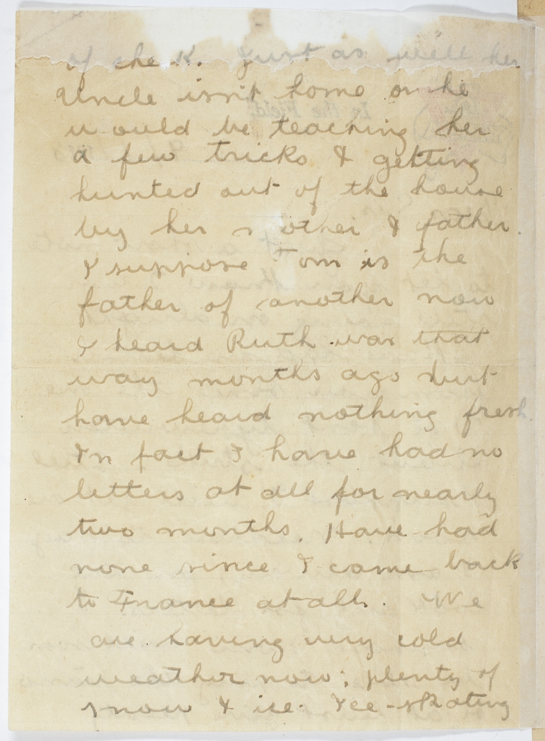 of cheek. Just as well her Uncle isn't home or he would be teaching her a few tricks & getting hunted out of the house by her mother & father. I suppose Tom is the father of another now. I heard Ruth was that way months ago but have heard nothing fresh. In fact I have had no letters at all for nearly two months. Have had none since I came back to France at all. We are having very cold weather now; plenty of snow & ice. Ice-skating