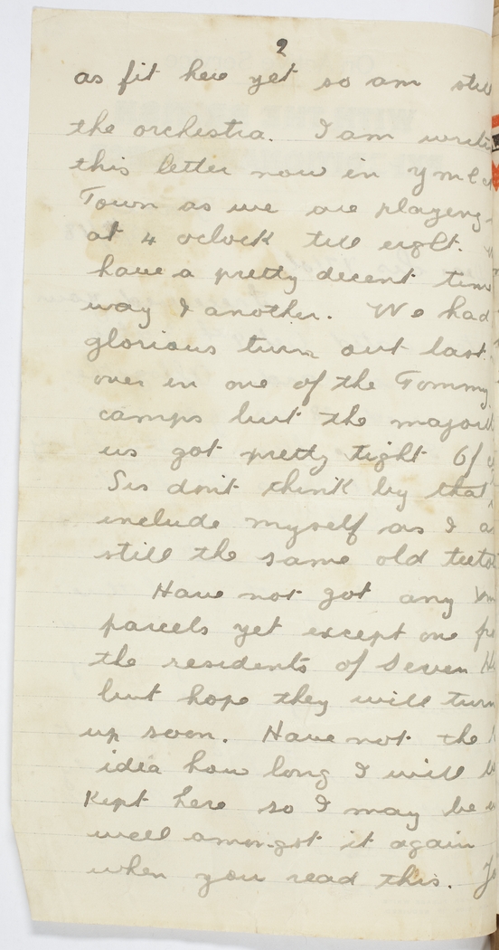 as fit here yet so am still in the orchestra. I am writing this letter now in YMCA in Town as we are playing here at 4 oclock till eight. We have a pretty decent time one way & another. We had a glorious turn out last night over in one of the Tommy camps but the majority of us got pretty tight [indecipherable]. Sis don't think by that I include myself as I am still the same old teetotaller. Have not got any Xmas parcels yet except one from the residents of Seven Hills but hope they will turn up soon. Have not the least idea how long I will be kept here so I may be in well amongst it again when you read this. You