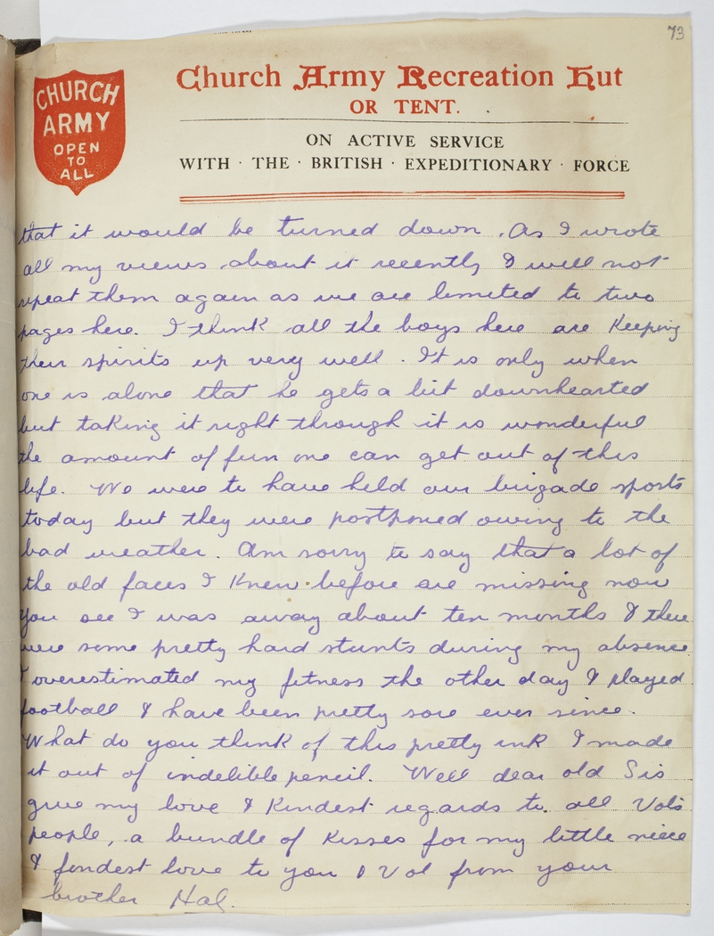that it would be turned down. As I wrote all my views about it recently I will not repeat them again as we are limited to two pages here. I think all the boys here are keeping their spirits up very well. It is only when one is alone that he gets a bit downhearted but taking it right through it is wonderful the amount of fun one can get out of this life. We were to have held our brigade sports today but they were postponed owing to the bad weather. Am sorry to say that a lot of the old faces I knew before are missing now. You see I was away about ten months & there were some pretty hard stunts during my absence. I overestimated my fitness the other day & played football & have been pretty sore ever since. What do you think of the pretty ink I made it out of indelible pencil. Well dear old Sis give my love & kindest regards to all Vol's people, a bundle of kisses for my little niece & fondest love to you & Vol from your brother Hal.