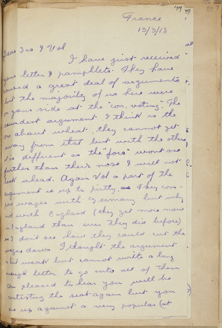 I have just received your letter & pamphlets. They have caused a great deal of arguments but the majority of us here were on your side at the "con. voting". The soundest argument I think is the one about wheat, they cannot get away from that but with the others it is different as the "fors" wont see further than their nose & will not look ahead. Again Vol a part of the argument is up to putty as They compare wages with Germany but why not with England (they get more now in England than ever they did before) so I don't see how they could cut the wages down. I thought the argument a bit weak but cannot write a long enough letter to go into all of them. Am pleased to hear you will be contesting the seat again but you are up against a very popular (at
