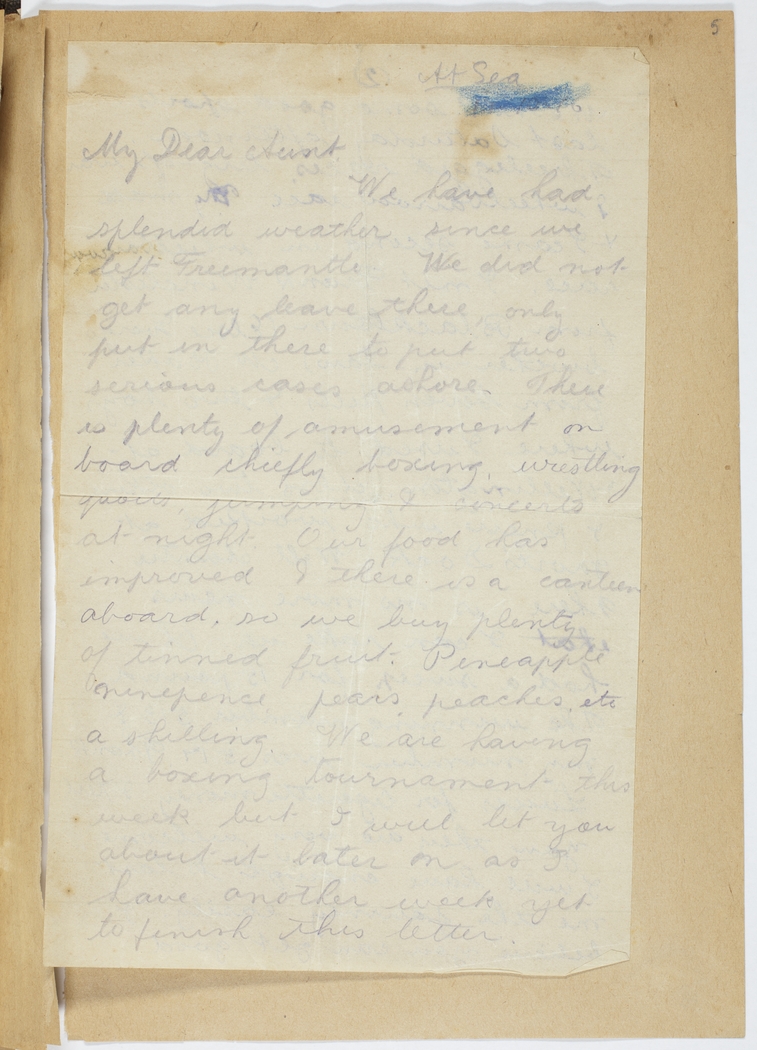 We have had splendid weather since we left Freemantle. We did not get any leave there, only put in there to put two serious cases ashore. There is plenty of amusement on board chiefly boxing, wrestling, quoits, jumping & concerts at night. Our food has improved & there is a canteen aboard, so we buy plenty of tinned fruit. Pineapple ninepence pears, peaches, etc a shilling. We are having a boxing tournament this week but I will let you about it later on as I have another week yet to finish this letter.