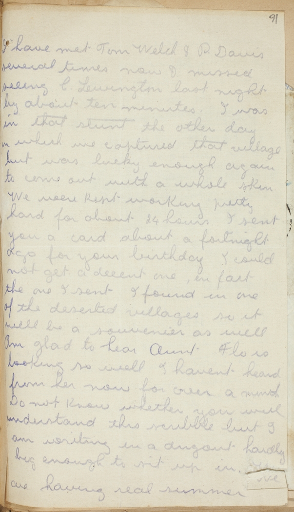 I have met Tom Welch & P. Davis several times now & missed seeing C. Lewington last night by about ten minutes. I was in that stunt the other day in which we captured that village but was lucky enough again to come out with a whole skin. We were kept working pretty hard for about 24 hours. I sent you a card about a fortnight ago for your birthday. I could not get a decent one, in fact the one I sent I found in one of the deserted villages so it will be a souvenier as well. Am glad to hear Aunt Flo is looking so well I haven't heard from her now for over a month. Do not know whether you will understand this scribble but I am writing in a dugout hardly big enough to sit up in. We are having real summer
