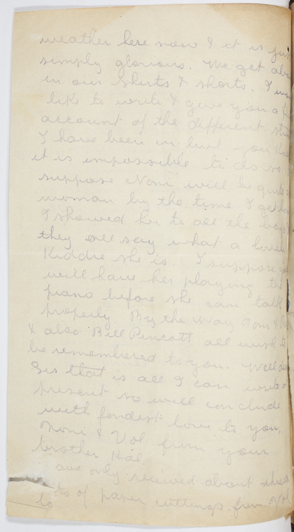 weather here now & it is just simply glorious. We get about in our shirts & shorts. I would like to write & give you a full account of the different stunts I have been in but you know it is impossible to do so. I suppose Noni will be quite a woman by the time I get home. I showed her to all the boys & they all say what a lovely kiddie she is. I suppose you will have her playing the piano before she can talk properly. By the way Tom & [indecipherable] & also Bill Pincott all wish to be remembered to you. Well dear Sis that is all I can write at present so will conclude with fondest love to you, Noni & Vol from your brother Hal.