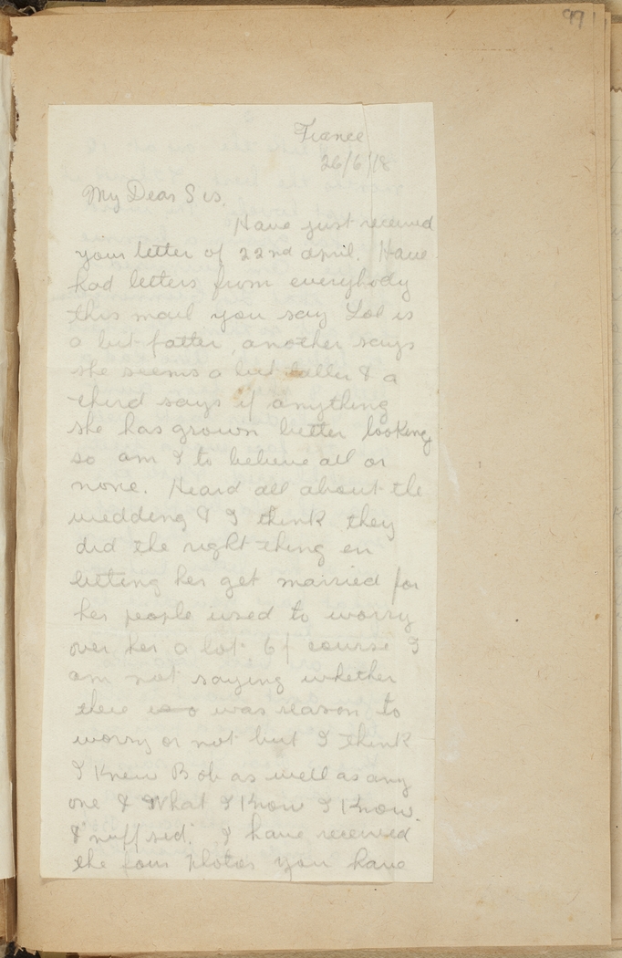 Have just received your letter of 22nd April. Have had letters from everybody this mail you say Lol is a bit fatter, another says she seems a bit taller & a third says if anything she has grown better looking so am I to believe all or none. Heard all about the wedding & I think they did the right thing in letting her get married for her people used to worry over her a lot. Of course I am not saying whether there was reason to worry or not but I think I knew Bob as well as any one & what I know I know & "nuff sed". I have received the four photos you have