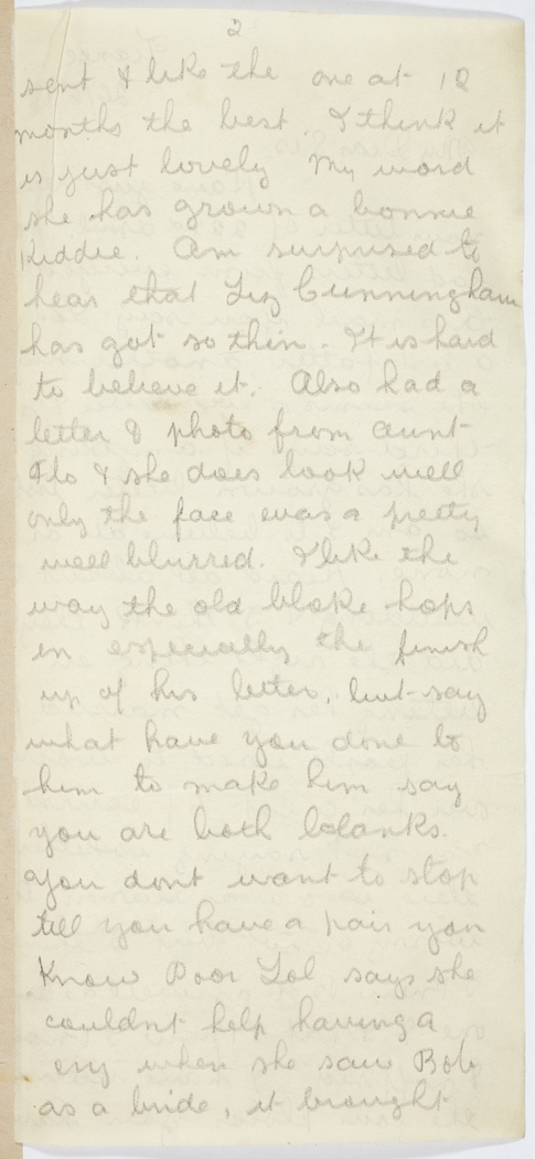 sent & like the one at 12 months the best. I think it is just lovely. My word she has grown a bonnie kiddie. Am surprised to hear that Liz Cunningham has got so thin. It is hard to believe it. Also had a letter & photo from Aunt Flo & she does look well only the face was a pretty well blurred. I like the way the old bloke hops in especially the finish up of his letter, but say what have you done to him to make him say you are both blanks. You don't want to stop till you have a pair you know. Poor Lol says she couldn't help having a cry when she saw Bob as a bride, it brought