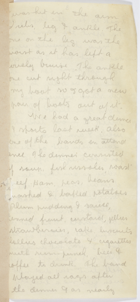 We had a great dinner & sports last week. Also one of the bands in attendance. The dinner consisted of soup, fish rissoles, roast beef, ham, peas, beans, mashed & baked potatoes, plum pudding & sauce, canned fruit, custard, jellies, strawberries, cake, biscuits, lollies, chocolate & cigarettes with rum punch, beer & coffee to drink. The band played all rags after the dinner & as nearly