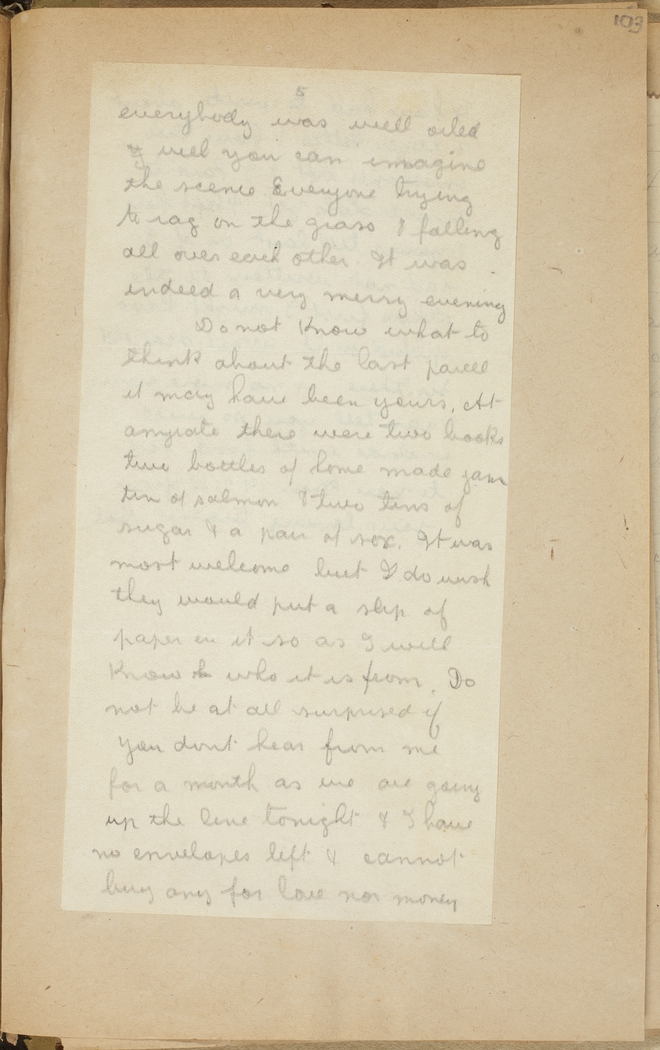 Do not know what to think about the past parcel it may have been yours. At any rate there were two books two bottles of home made jam tin of salmon & two tins of sugar & a pair of sox. It was most welcome but I do wish they would put a slip of paper in it so as I will know who it is from. Do not be at all surprised if you don't hear from me for a month as we are going up the line tonight & I have no envelopes left & cannot buy any for love nor money