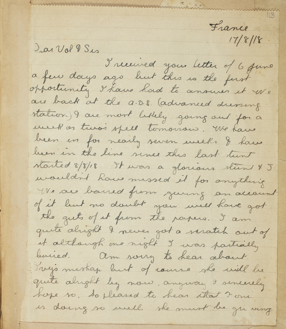 I received your letter of 6 June a few days ago but this is the first opportunity I have had to answer it. We are back at the A.D.S. (Advanced dressing station) & are most likely going out for a week or two's spell tomorrow. We have been in for nearly seven weeks & have been in the line since this last stunt started 8/8/18. It was a glorious stunt & I wouldn't have missed it for anything. We are barred from giving an account of it but no doubt you will have got the guts of it from the papers. I am quite alright & never got a scratch out of it although one night I was partially buried. Am sorry to hear about Ivy's mishap but of course she will be quite alright by now, anyway I sincerely hope so. So pleased to hear that Noni is doing so well. She must be growing