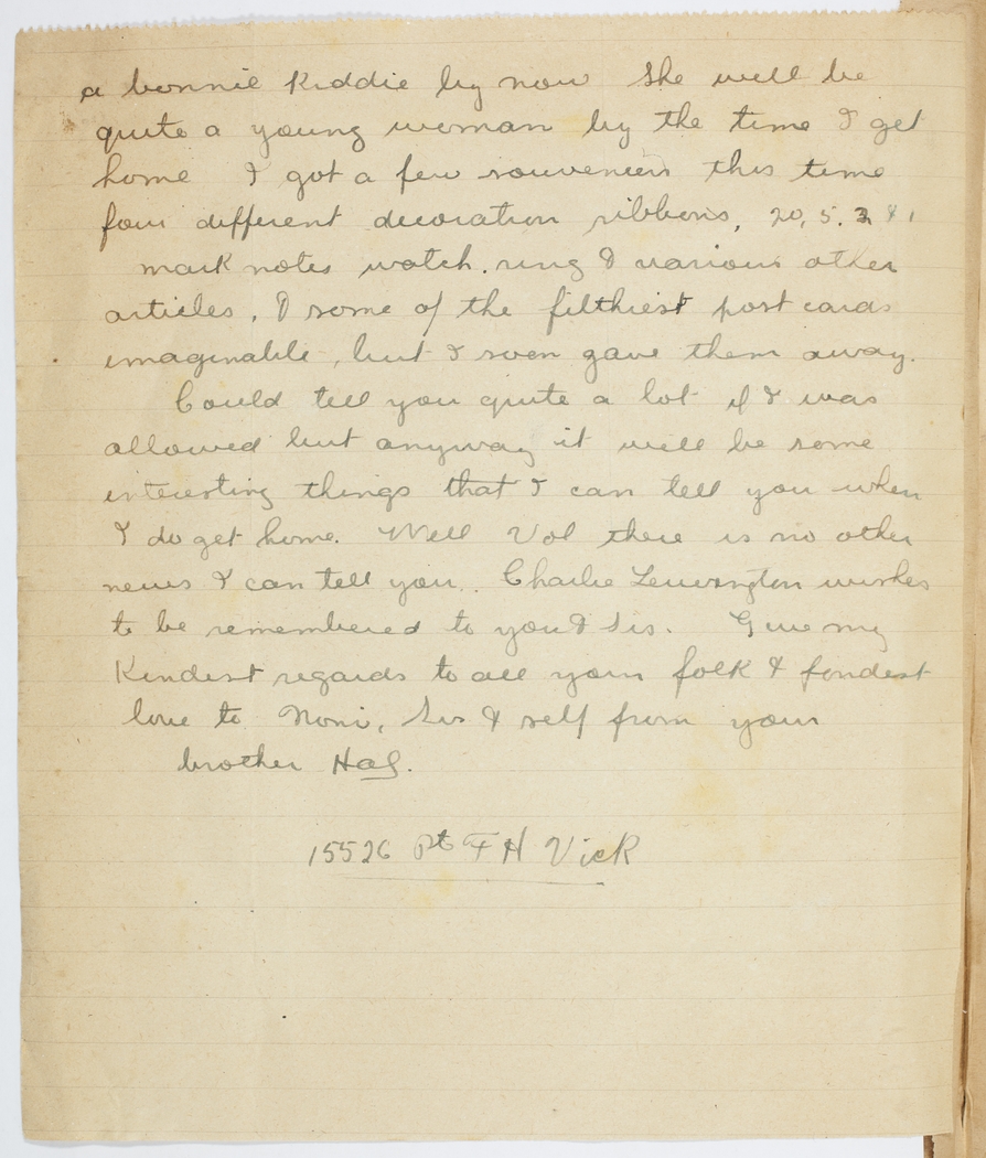 Could tell you quite a lot if I was allowed but anyway it will be some interesting things that I can tell you when I do get home. Well Vol there is no other news I can tell you. Charlie Lewington wishes to be remembered to you & Sis. Give my kindest regards to all your folk & fondest love to Noni, Sis & self from your brother Hal.