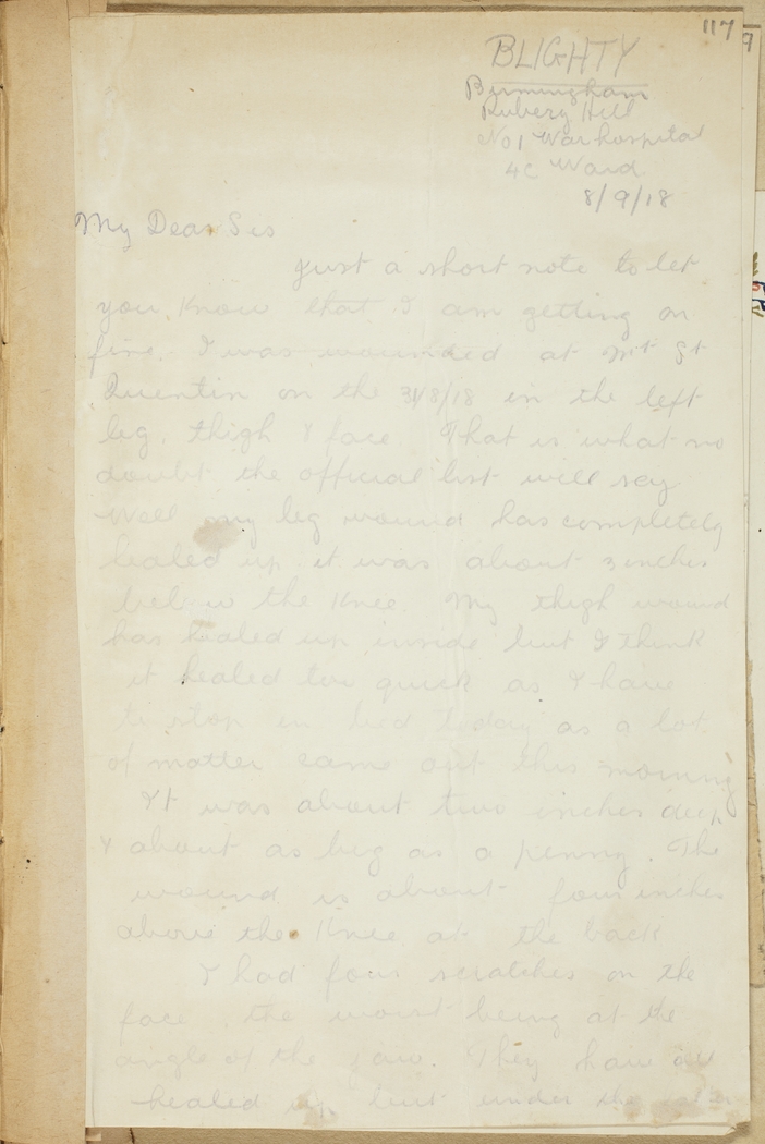 Just a short note to let you know that I am getting on fine. I was wounded at Mt St Quentin on 31/8/18 in the left leg, thigh & face. That is what no doubt the official list will say. Well my leg wound has completely healed up it was about 3 inches below the knee. My thigh wound has healed up inside but I think it healed too quick as I have to stop in bed today as a lot of matter came out this morning. It was about two inches deep & about as big as a penny. The wound is about four inches above the knee at the back.