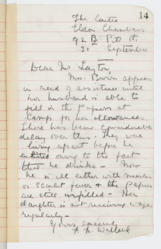 Mrs. Brown appears in need of assistance until her husband is able to fill in the Papers at Camp for her allowances. There has been considerable delay over this. They were living apart before he enlisted owing to the fact that he drinks – Now he is ill either with measles or scarlet fever & the Papers are still unfilled – Her daughter is not receiving wages regularly –