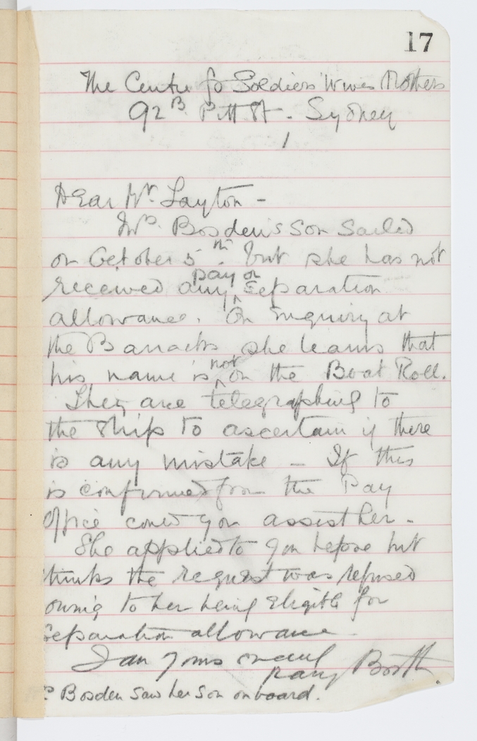 Mrs. Bosden's son sailed on October 5th. but she has not received any pay or separation allowance. On enquiry at the Barracks she learns that his name is not on the Boat Roll.