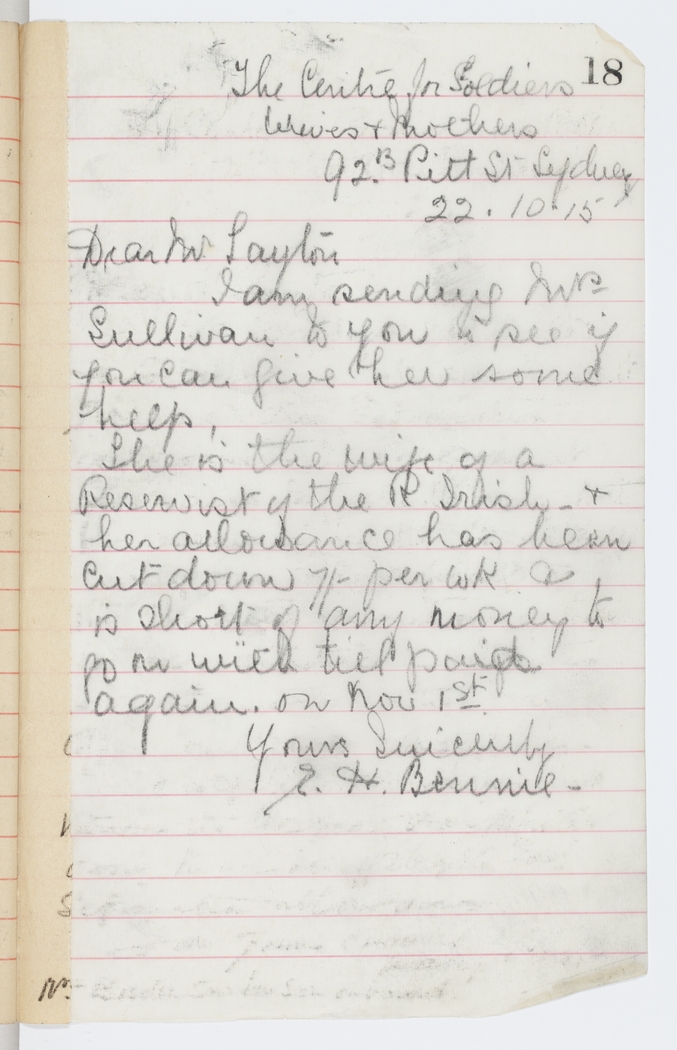 She is the wife of a Reservist of the R. Irish – & her allowance has been cut down 7/- per wk. & is short of any money to go on with till paid again. on Nov 1st.