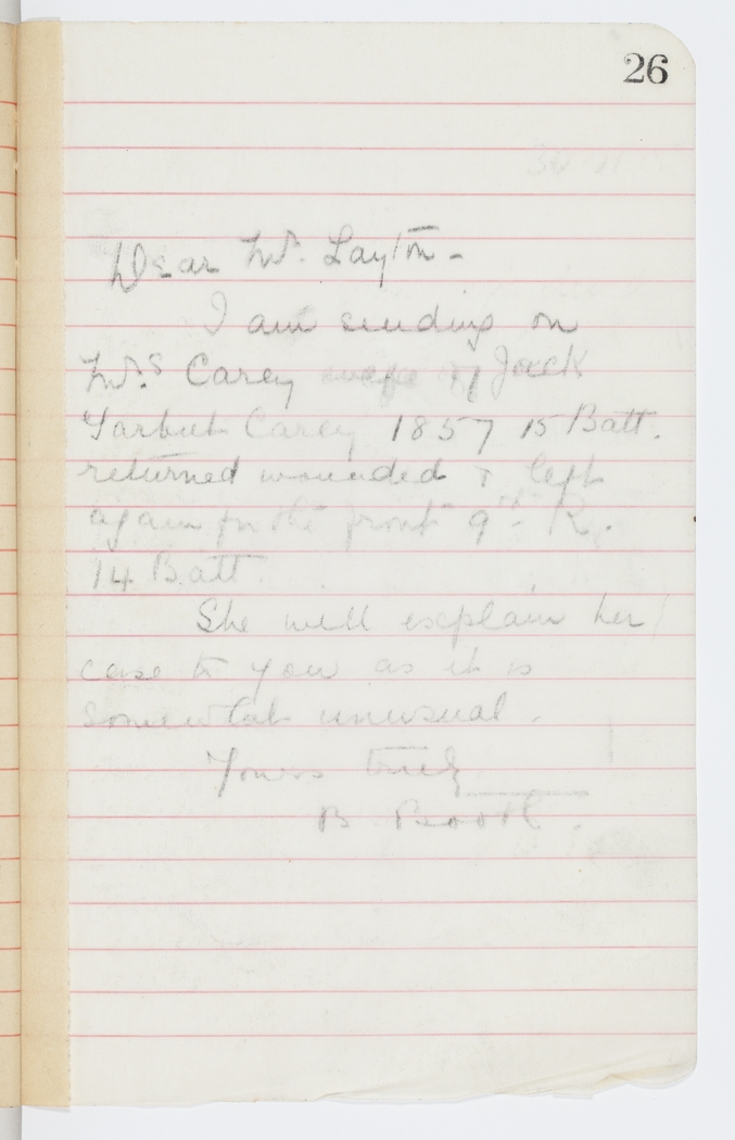 I am sending on Mrs. Carey wife of Jack Tarbut Carey 1857 15 Batt. returned wounded & left again for the front 9th R. 14 Batt.