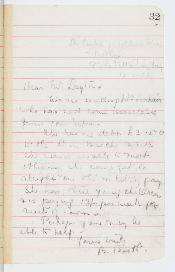 She has one debt £3-15-0 to the Bon Marche which she seems unable to meet otherwise she can get on alright on the military pay.