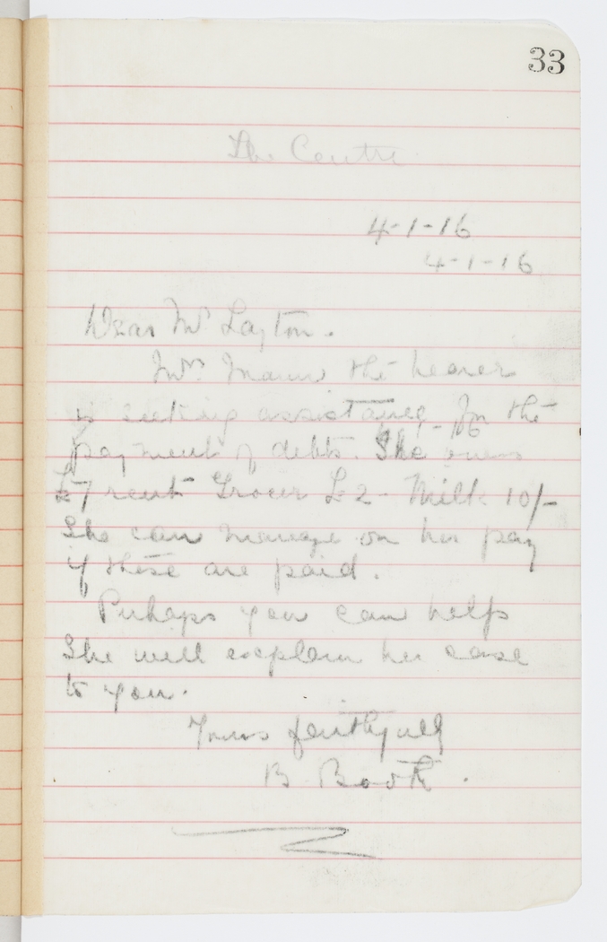 Mrs. Main the bearer is seeking assistance for the payment of debts. She owes £7 rent Grocer £2 Milk 10/- She can manage on her pay if these are paid.