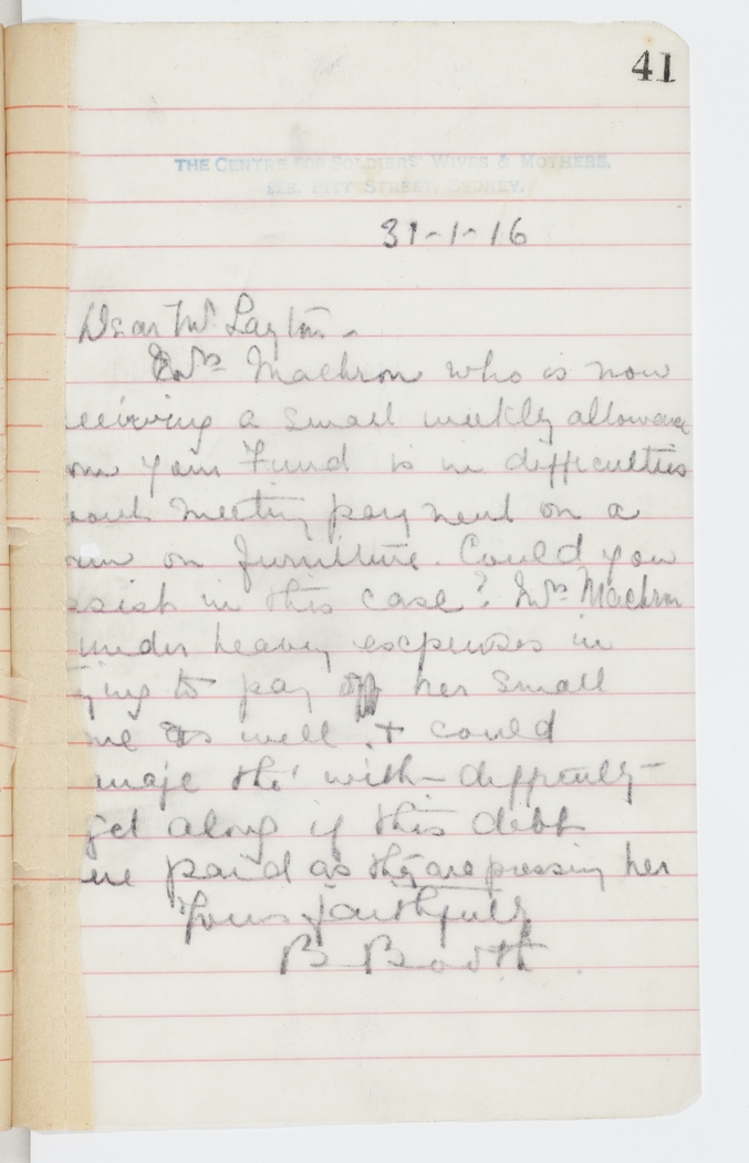 Mrs. Machron who is now receiving a small weekly allowance from your Fund is in difficulties about meeting payment on a [indecipherable] on furniture. Could you assist in this case? Mrs. Machron is under heavy expenses in trying to pay off her small home as well & could manage tho' with difficulty to get along if this debt were paid as they are pressing her