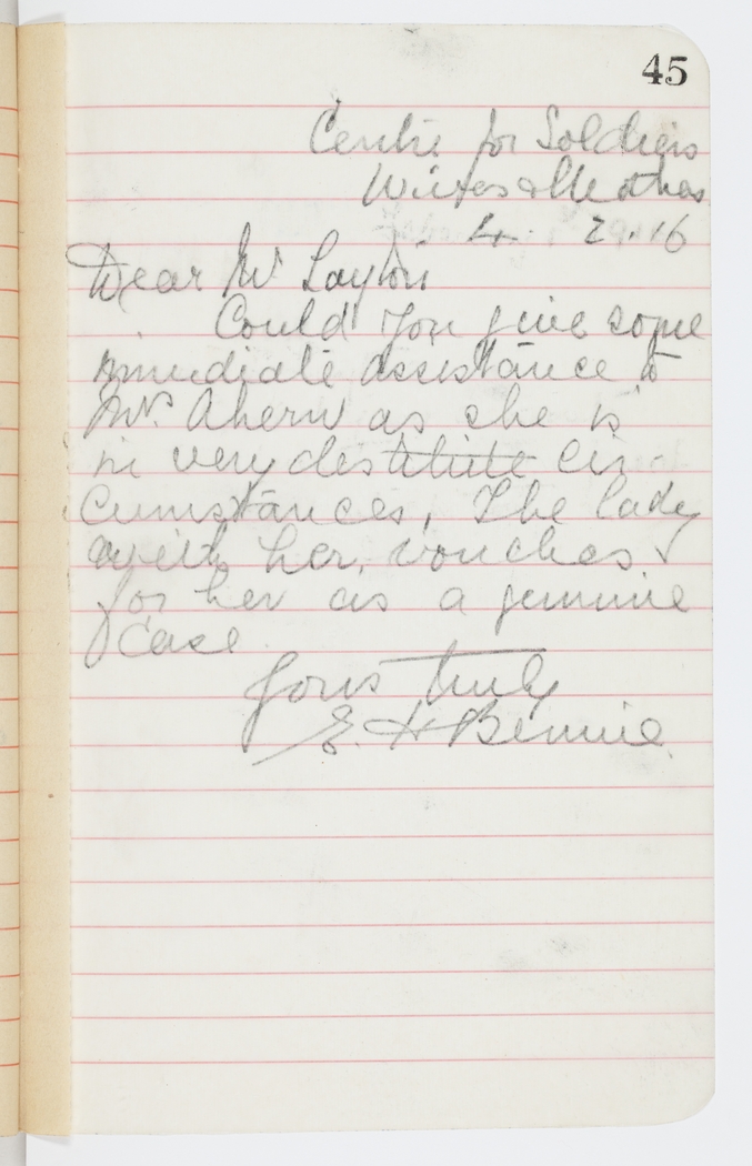 Could you give some immediate assistance to Mrs. Ahern as she is in very destitute circumstances. The lady with her vouches for her as a genuine case.