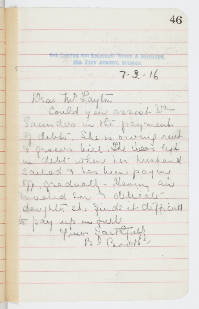 Could you assist Mrs. Saunders in the payment of debts. She is owing rent & grocer's bill. She was left in debt when her husband sailed & has been paying off gradually – Having an invalid son & delicate daughter she finds it difficult to pay up in full