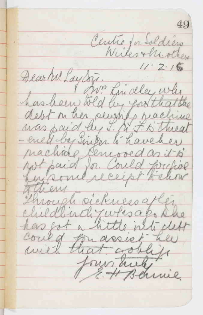 Mrs. Lindley who has been told by you that the debt on her sewing machine was paid by L.M.F. is threatened by Singer to have her machine removed as it is not paid for. Could you give her some receipt to show to them –