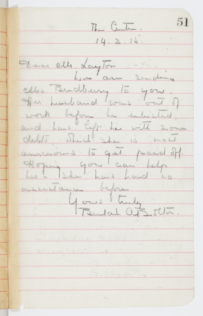 We are sending Mrs. Bridbury to you. Her husband was out of work before he enlisted and has left her with some debts, which she is most anxious to get paid off. Hoping you can help her – she has had no assistance before