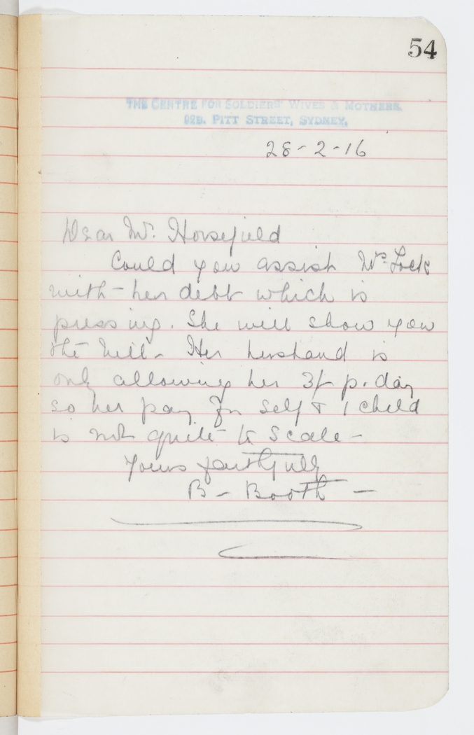 Could you assist Mrs. Lock with her debt which is pressing. She will show you the bill – Her husband is only allowing her 3/- p. day so her pay for self & 1 child is not quite to scale –