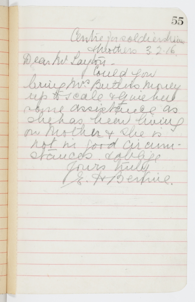 Could you bring Mrs. Butlers money up to scale & give her some assistance as she has been living on Mother & she is not in good circumstances & oblige