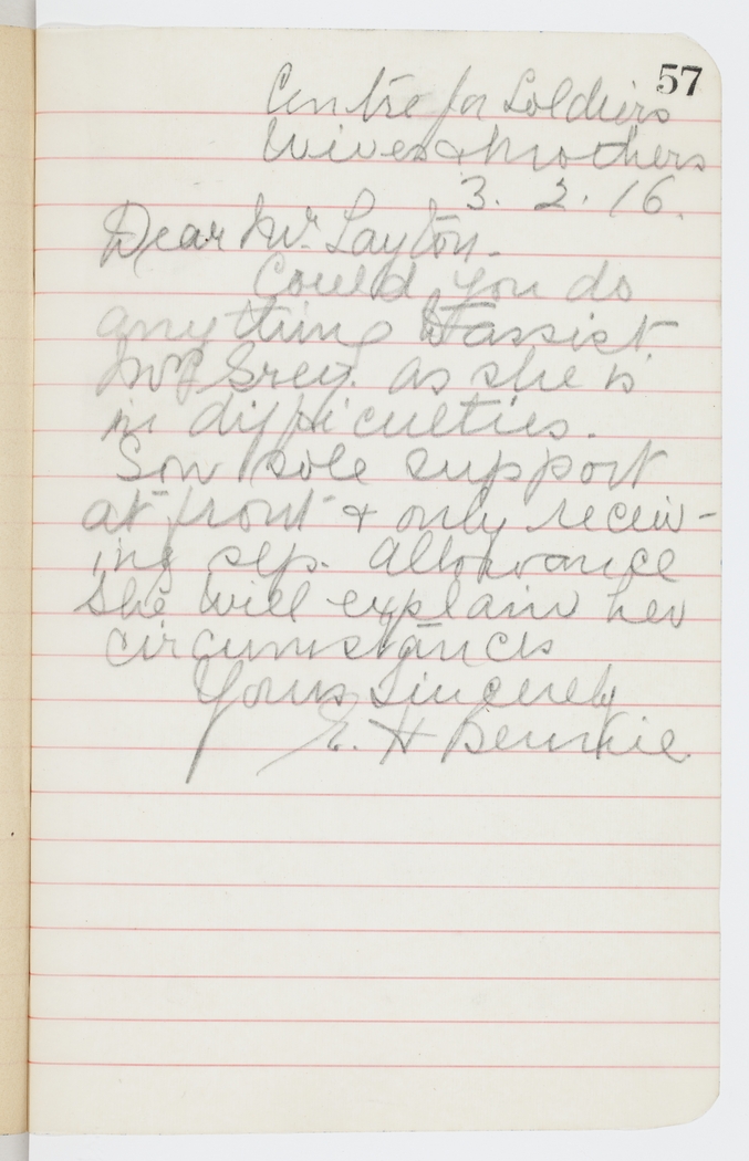 Could you do anything to assist Mrs. Grey as she is in difficulties. Son sole support at front & only receiving sep. allowance She will explain her circumstances
