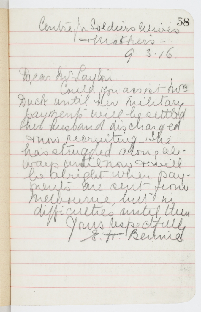 Could you assist Mrs. Duck until her military payments will be settled her husband discharged & now recruiting – She has struggled along always until now & will be alright when payments are sent from Melbourne, but in difficulties until then