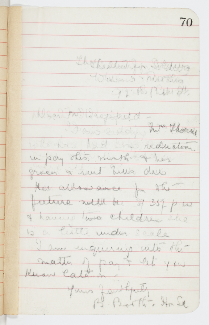 I am sending Mrs. Thorne who has had some reduction in pay this month & her grocer & rent bills due