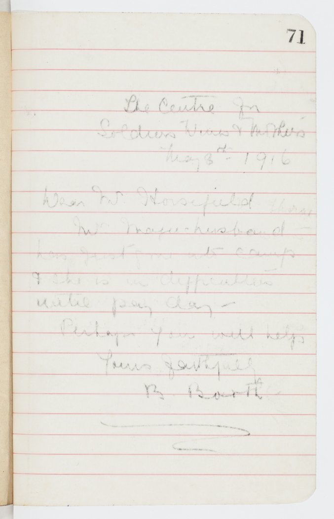 Mrs. Magees husband has just gone into camp & she is in difficulties until pay day –
