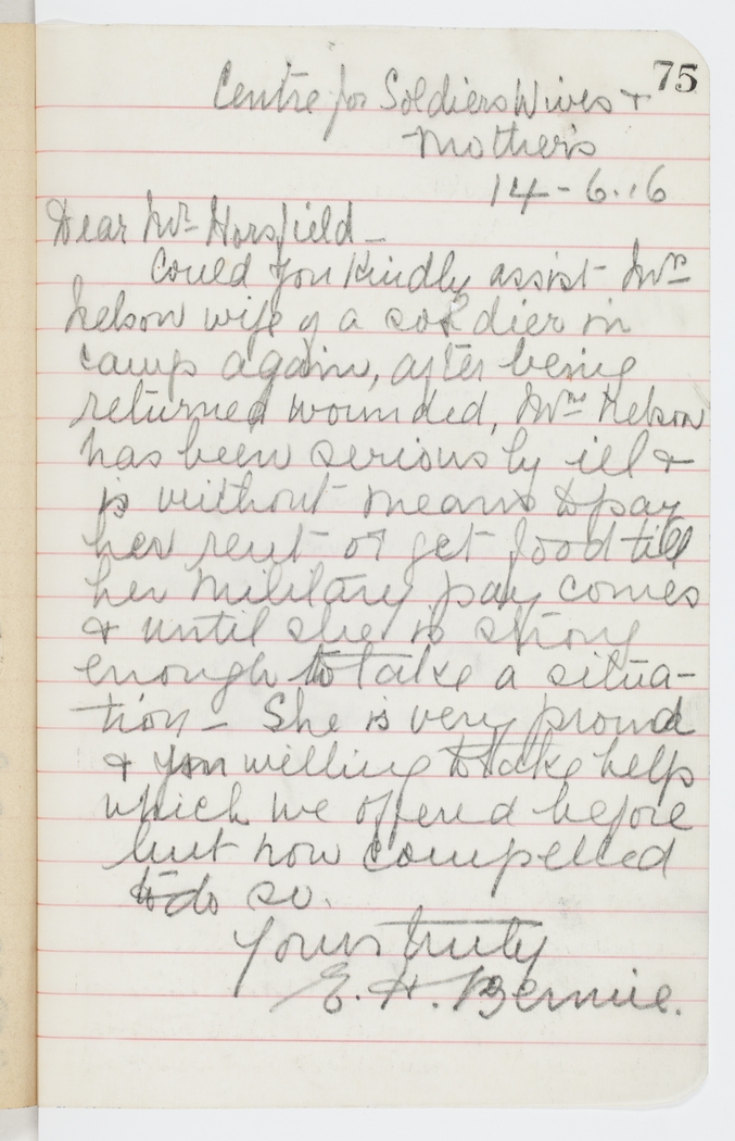 Could you kindly assist Mrs. Nelson wife of a soldier in camp again, after being returned wounded, Mrs. Nelson has been seriously ill & is without means to pay her rent or get food till her military pay comes & until she is strong enough to take a situation – She is very proud & unwilling to take help which we offered before but now compelled to do so.