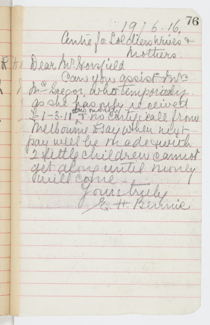 Can you assist Mrs. McGregor, who temporarily as she has only received £1-3.11 this month & no certificate from Melbourne to say when next pay will be made & with 2 little children cannot get along until money will come –