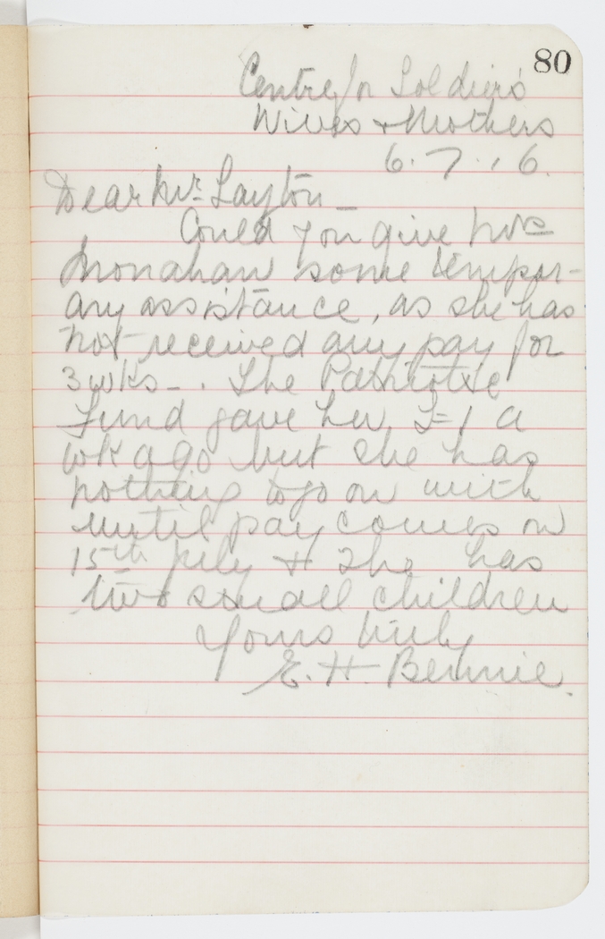 Could you give Mrs. Monahan some temporary assistance, as she has not received any pay for 3 wks – The Patriotic Fund gave her £1 a wk ago but she has nothing to go on with until pay comes on 15th July & she has two small children