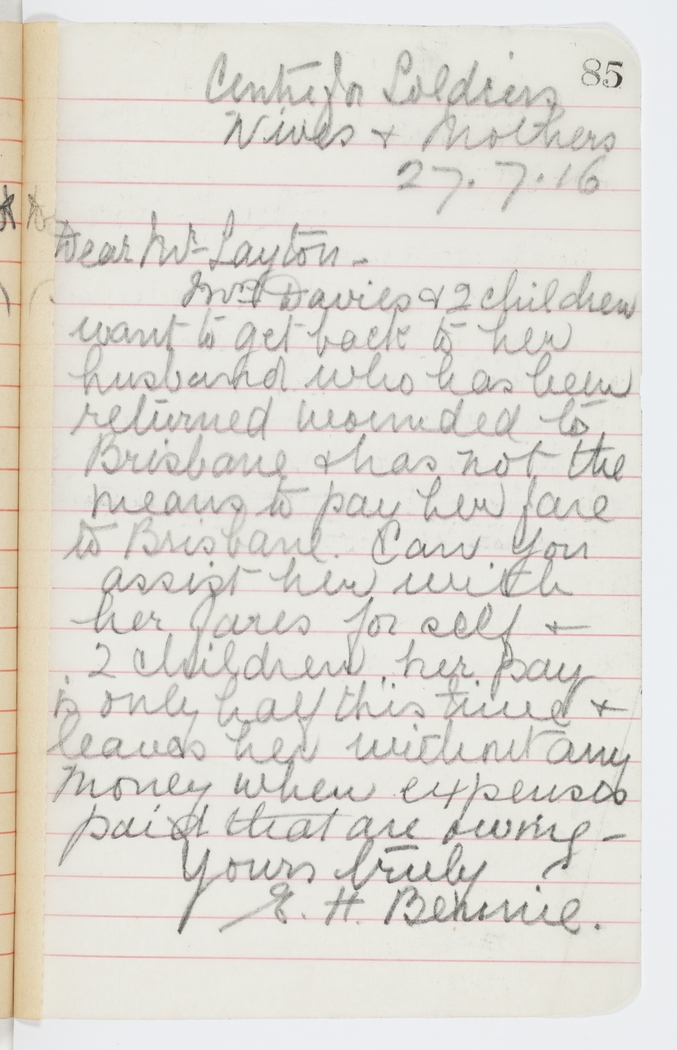 Mrs. Davies & 2 children want to get back to her husband who has been returned wounded to Brisbane & has not the means to pay her fare to Brisbane. Can you assist her with her fares for self & 2 children, her pay is only half this time & leaves her without any money when expenses paid that are owing –
