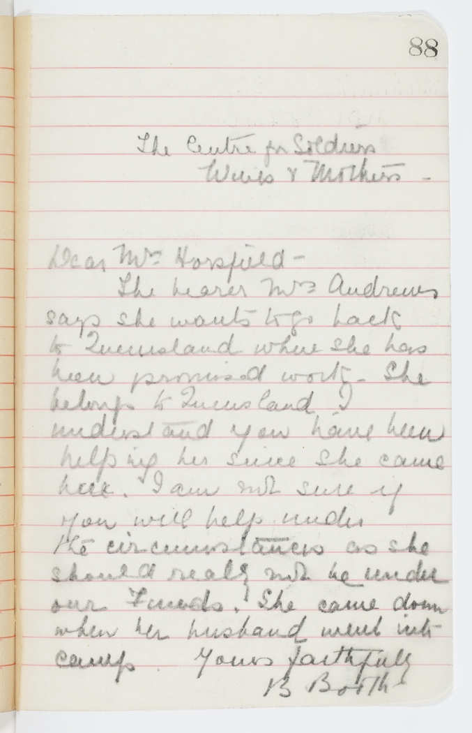 The bearer Mrs. Andrews says she wants to go back to Queensland where she has been promised work. She belongs to Queensland I understand and you have been helping her since she came here. I am not sure if you will help under the circumstances as she should really not be under our Funds. She came down when her husband went into camp.