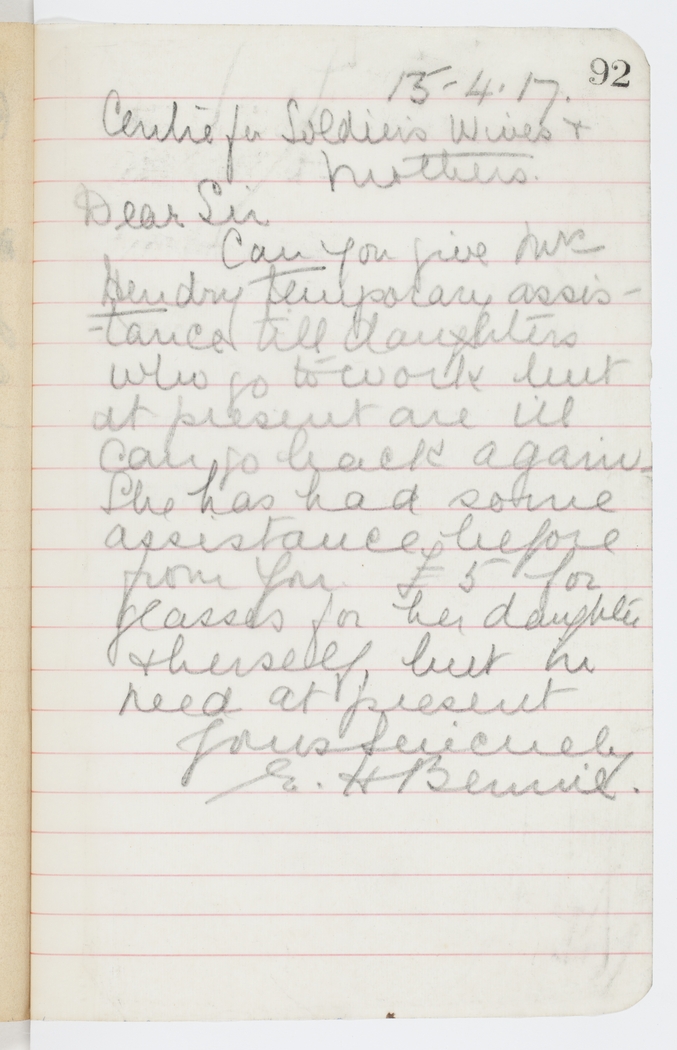 Can you give Mrs. Hendry temporary assistance till daughters who go to work but at present are ill can go back again. She has had some assistance before from you £5 for glasses for her daughter & herself, but in need at present