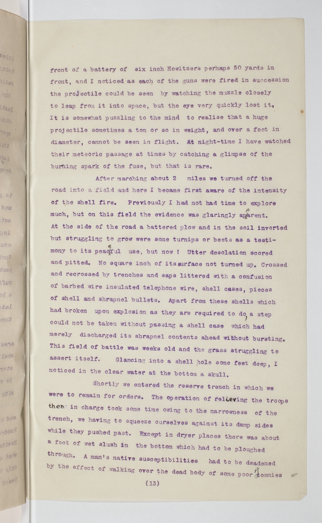 After marching about 2 miles we turned off the road into a field and here I became first aware of the intensity of the shell fire. Previously I had not had time to explore much, but on this field the evidence was glaringly apparent. At the side of the road a battered plow and in the soil inverted but struggling to grow were some turnips or beets as a testimony to its peaceful use, but now! Utter desolation scored and pitted. No square inch of its surface not turned up. Crossed and recrossed by trenches and saps littered with a confusion of barbed wire insulated telephone wire, shell cases, pieces of shell and shrapnel bullets. Apart from these shells which had broken upon explosion as they are required to do, a step could not be taken without passing a shell case which had merely discharged its shrapnel contents ahead without bursting. This field of battle was weeks old and the grass struggling to assert itself. Glancing into a shell hole some feet deep, I noticed in the clear water at the bottom a skull.
