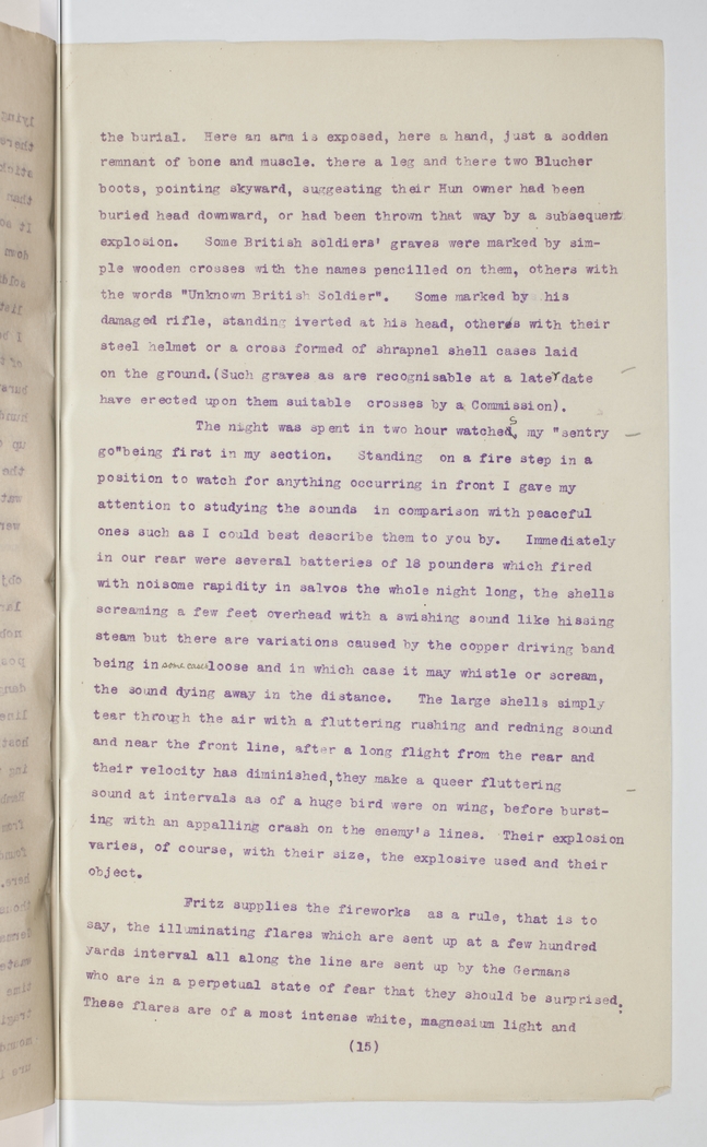 The night was spent in two hour watches, my "sentry go" being first in my section. Standing on a fire step in a position to watch for anything occurring in front I gave my attention to studying the sounds in comparison with peaceful ones such as I could best describe them to you by. Immediately in our rear were several batteries of 18 pounders which fired, with noisome rapidity in salvos the whole night long, the shells screaming a few feet overhead with a swishing sound like hissing steam but there are variations caused by the copper driving band being in some cases loose and in which case it may whistle or scream, the sound dying away in the distance. The large shells simply tear through the air with a fluttering rushing and redning sound and near the front line, after a long flight from the rear and their velocity has diminished, they make a queer fluttering sound at intervals as of a huge bird were on wing, before bursting with an appalling crash on the enemy's lines. Their explosion varies, of course, with their size, the explosive used and their object.