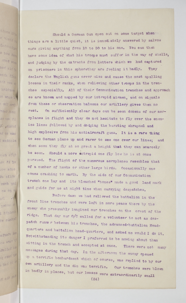 Should a German Gun open out on some target when things are a little quiet, it is immediately answered by salvos ours giving anything from 10 to 50 to his one. You can then have some idea of what his troops must suffer in the way of shells, and judging by the extracts from letters which we had captured on prisoners in this sphere they are feeling it badly. They declare the English guns never miss and cause the most apalling losses in their ranks, when relieving other troops in the trenches especially. All of their Communication trenches and approaches are known and mapped by our intrepid airmen, and on signals from these or observation baloons our artillery gives them no rest. On sufficiently clear days can be seen dozens of our aeroplanes in flight and they do not hesitate to fly over the enemies lines followed by and dodging the bursting shrapnel and high explosive from his antiaircraft guns. It is a rare thing to see German plane up and rarer to see one over our lines; and when seen they fly at so great a height that they can scarcely be seen. Should a more intrepid one fly low he is at once pursued. The flight of the numerous aeroplanes resembles that of a number of hawks or other large birds. Occasionally one comes crashing to earth. By the side of our Communication trench one lay and its bleached "bones" made a good land mark and guide for me at night time when carrying despatches.